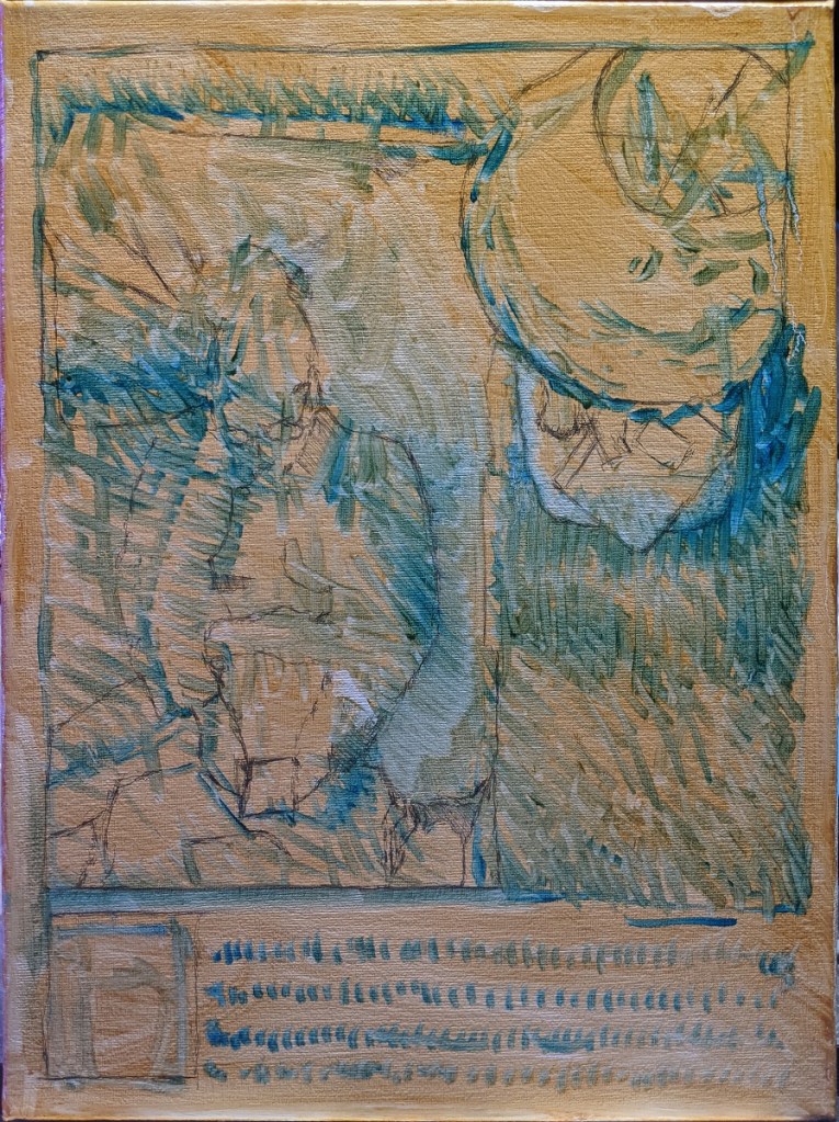 So in this first picture you’ll see some oil stains in the canvas followed by some pencil drawings, trying to find the proportions of the composition.