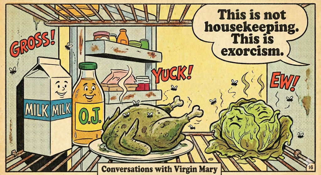 “Don’t you realize yet? Listen carefully: the Virgin did not come to sell you another principle. She came to awaken what you already knew. This is not advice, this is remembrance. The fridge, the sock drawer, the broom closet — they were only doors to help you see. You do not need to borrow anyone else’s wisdom, old or new. You only need to clear the space inside so your own voice can echo again. And so we can stop here, for now. You have the task: throw away what is rotten, in your house and in your head. Begin again, and again, until order grows strong enough to carry you. That is the first step — because if the house is wrong, everything is wrong. And if the house is right, you may finally live in it. And once you live in it, you may finally notice the messengers at your door.”