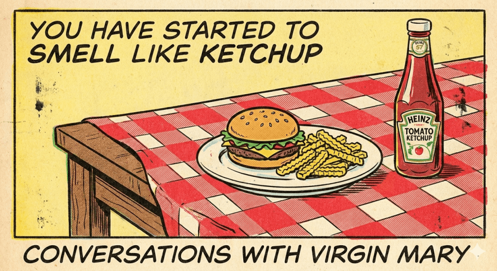 “But the ketchup? Mary should talk about the teachings of her son, love, bread wine converted in the body of Christ, you know, that’s the Divine voice.”